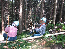 全員で約60本を用材化しましたが、活用地迄 約400Mも人力で運ばねばならないことから、 副代表の本間さんの提案で「現地乾燥」に決め ました。「梢」は秋のイベント用クラフト材として持ち 帰りました。 |