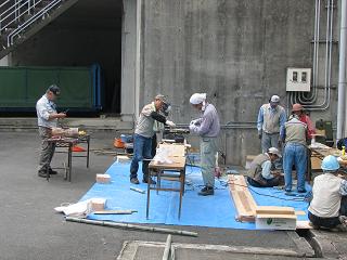 桧の丸太の玉切の体験コーナーの指導、コースターに焼印、花器、竹炭等の作品を 販売。