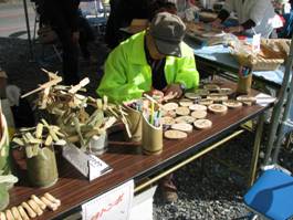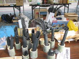 その他の出品物 ・ ポックリ・・・5センチ位の長さの竹の節に紐を通して、下駄として遊ぶ玩具。 ・ 孫の手 ・ 青竹踏み ・ キースタンド・・・桧の梢の皮を剥いたもの。 ・ 芸術炭・・・果物、花、小枝などの炭化品 ・ けん玉 ・ バランストンボ ・ 竹炭 ・ 竹酢液 「栞」と「芸術炭」は、初めての試みでしたが、皆様に関心をもって見ていただけました。