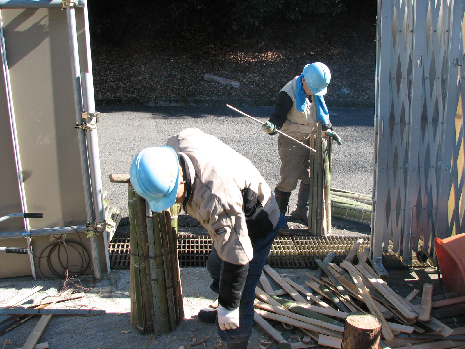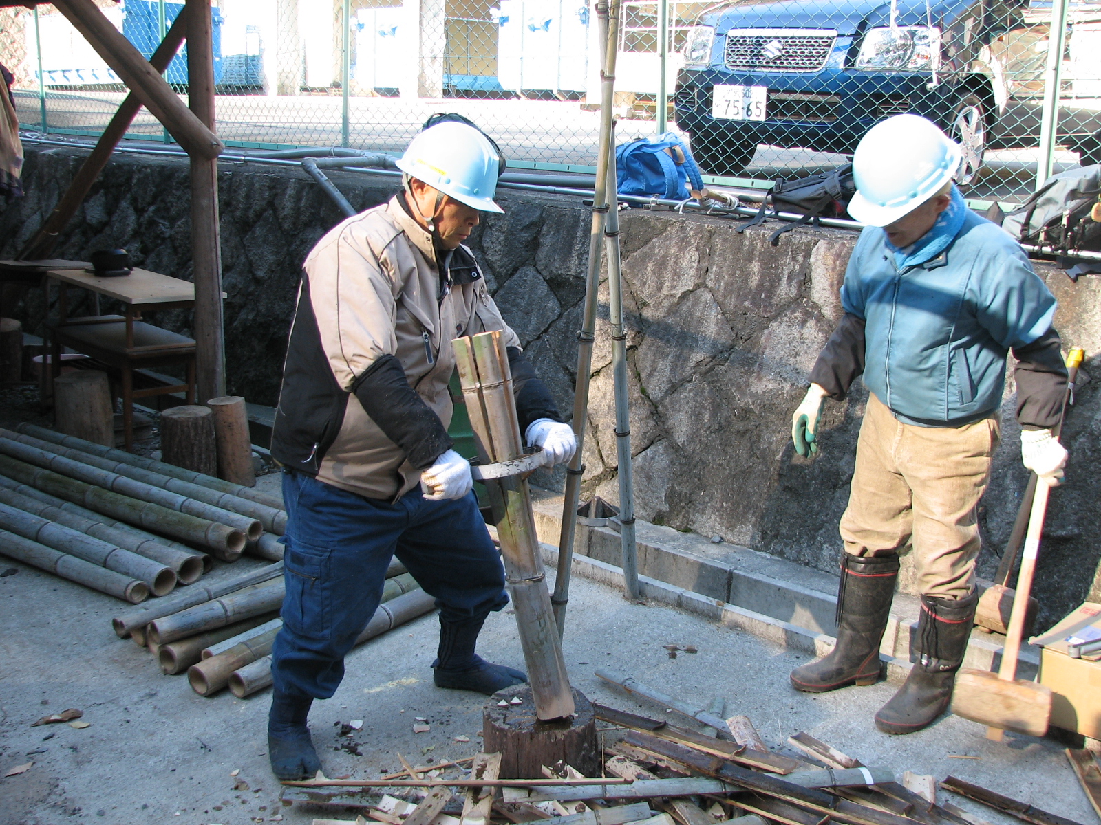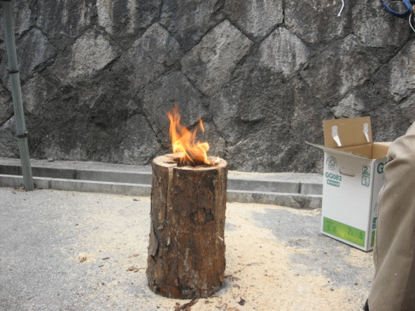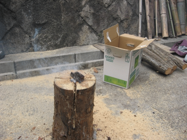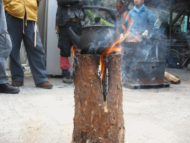 2 椎茸、ヒラタケの種駒(菌)を原木(コナラ、ミズナラ、シデ、サクラ ![]() 3 玉切した松の木でこんなことが出来ますよ!! 直径φ22~23cm、高さ50cmぐらいの玉切した、松の木に チェンソーで十文字に切り込みを深さ30㎝位入れて中央に 炭火を乗せますと切込みから空気を取り入れて、数分で燃え 上がります。 火の用心、後始末は十分気をつけてください ![]() ![]() 炭火を乗せたところ 数分で発火しました ![]() ![]() ヤカンで湯沸し 炭焼窯に入れました、幻想的で炎が花の様! 4 昼食時、団欒の一時 終島本森のクラブ 定例活動(1月24日)記録 中江 記 活動内容は記念の森で、炭材作り作業と雑木林の除伐作業の2班に分かれて作業をしました。 焚き火をしましたが、晴れた暖かい日和で、楽しく身体を動かしました。 炭材作り作業は、昨年11月の定例活動日に3~5年生育した竹を伐採し、玉切りしたもうそうちくを85㎝の定寸に切断し、5割の竹割り器で短冊形に分割して、節を取り、φ25~30㎝の束にして針金で縛るまでの、 1電動鋸で定寸切断、2竹割り器で短冊形に分割、3節取り、4束ね の4工程の作業で、2工程目の竹割りが大変な作業で、市販の鋳物製の竹割り器では用を成さず、特別に鋼鉄で自作したものを使い作業をしています。 6人で4時間ほど作業をして、1窯分の竹の炭材を確保出来ました、除伐作業班が上物材と炙り木を確保して下さったので、炭焼きの準備が出来ました。 ご苦労様でした!!! この後、有志で新年会を賑やかに、楽しく行いました!! 尚、竹炭のことを知りたい方はインターネットのGoogleで「竹炭」で検索すると、作り方、効果、使用方法・・・・等、なんでも知ることが出来ます。