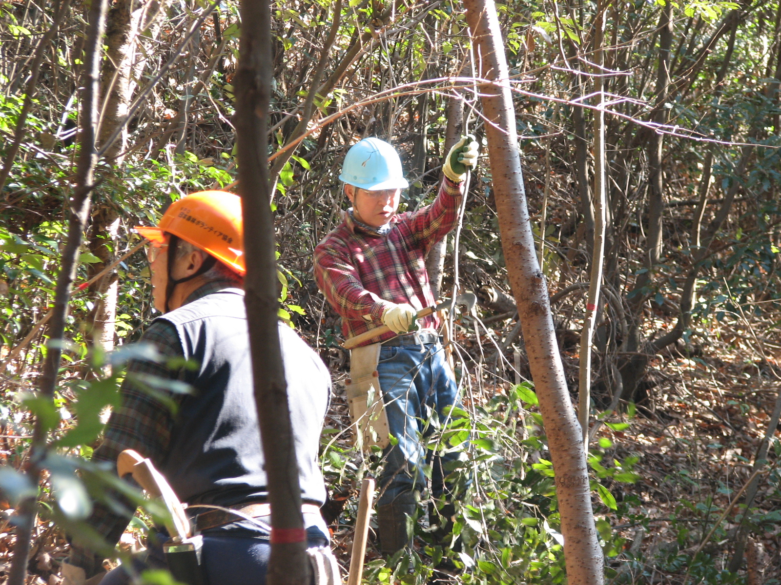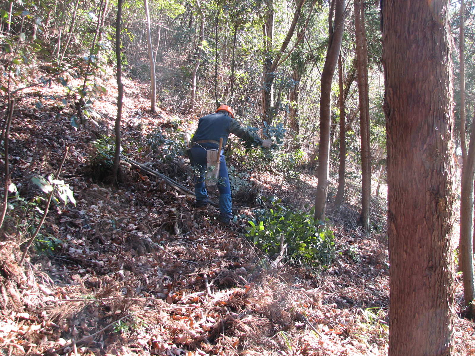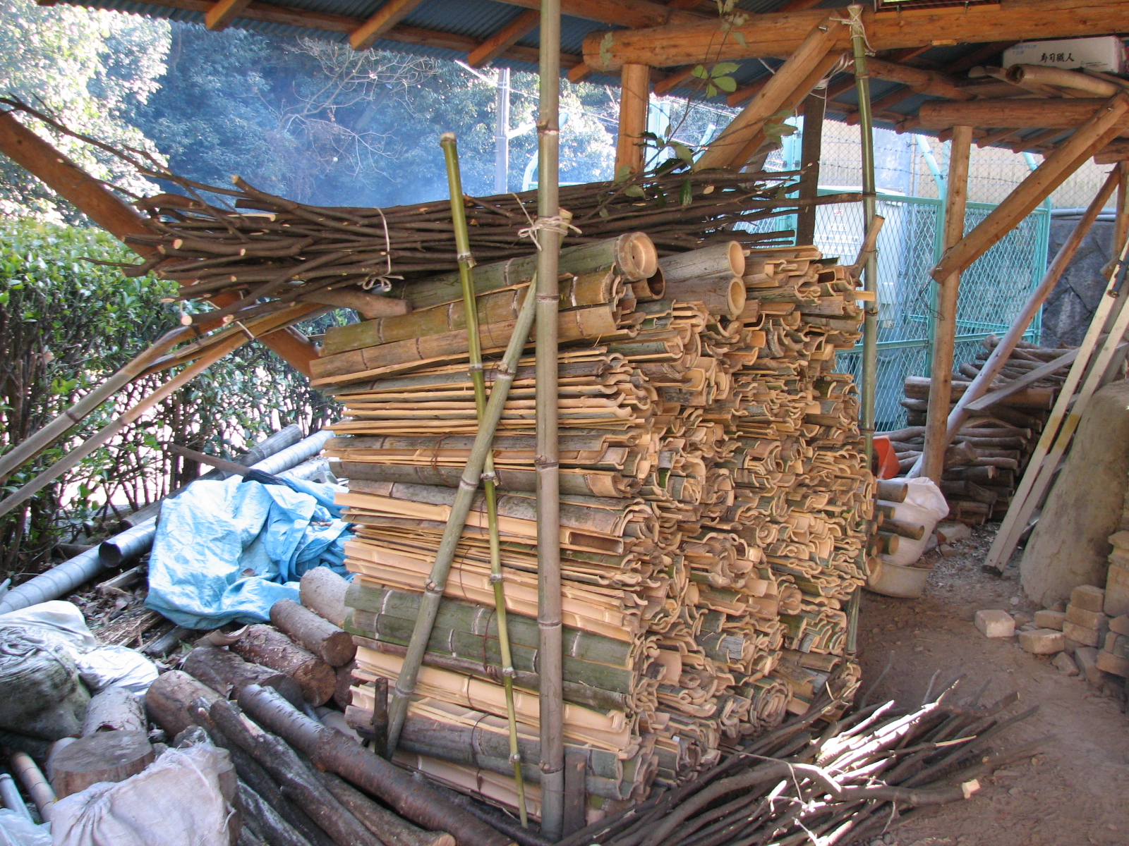 2 椎茸、ヒラタケの種駒(菌)を原木(コナラ、ミズナラ、シデ、サクラ ![]() 3 玉切した松の木でこんなことが出来ますよ!! 直径φ22~23cm、高さ50cmぐらいの玉切した、松の木に チェンソーで十文字に切り込みを深さ30㎝位入れて中央に 炭火を乗せますと切込みから空気を取り入れて、数分で燃え 上がります。 火の用心、後始末は十分気をつけてください ![]() ![]() 炭火を乗せたところ 数分で発火しました ![]() ![]() ヤカンで湯沸し 炭焼窯に入れました、幻想的で炎が花の様! 4 昼食時、団欒の一時 終島本森のクラブ 定例活動(1月24日)記録 中江 記 活動内容は記念の森で、炭材作り作業と雑木林の除伐作業の2班に分かれて作業をしました。 焚き火をしましたが、晴れた暖かい日和で、楽しく身体を動かしました。 炭材作り作業は、昨年11月の定例活動日に3~5年生育した竹を伐採し、玉切りしたもうそうちくを85㎝の定寸に切断し、5割の竹割り器で短冊形に分割して、節を取り、φ25~30㎝の束にして針金で縛るまでの、 1電動鋸で定寸切断、2竹割り器で短冊形に分割、3節取り、4束ね の4工程の作業で、2工程目の竹割りが大変な作業で、市販の鋳物製の竹割り器では用を成さず、特別に鋼鉄で自作したものを使い作業をしています。 6人で4時間ほど作業をして、1窯分の竹の炭材を確保出来ました、除伐作業班が上物材と炙り木を確保して下さったので、炭焼きの準備が出来ました。 ご苦労様でした!!! この後、有志で新年会を賑やかに、楽しく行いました!! 尚、竹炭のことを知りたい方はインターネットのGoogleで「竹炭」で検索すると、作り方、効果、使用方法・・・・等、なんでも知ることが出来ます。